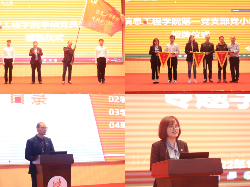 学习会上,信息工程学院院长朱祎作了学院电子信息专业硕士培育点建设情况报告,举行了申硕党员先锋队授旗仪式和党小组授牌仪式,筑起“党建+业务”双融双促生态圈。