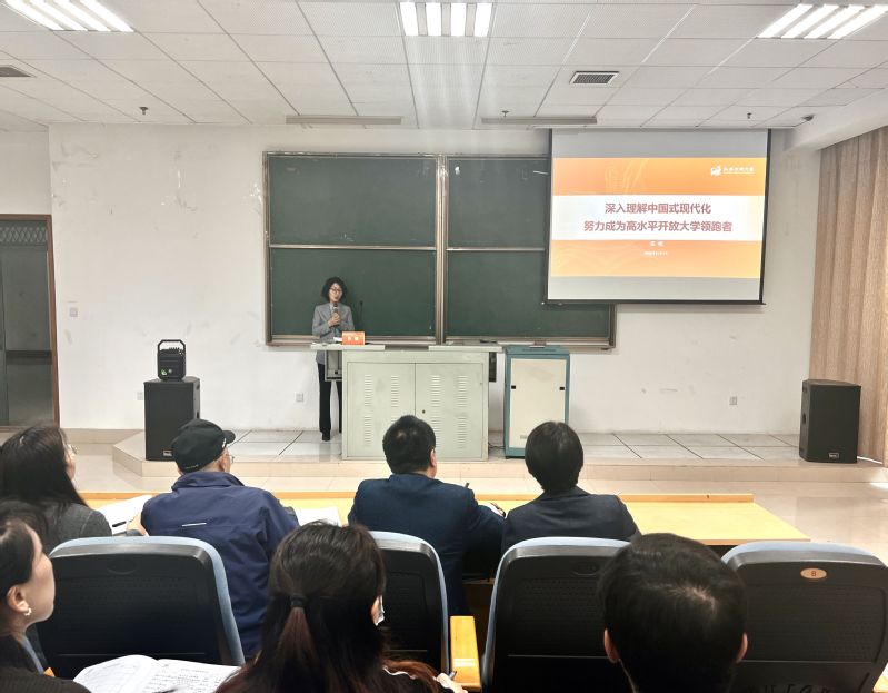 张晓副校长以《深入理解中国式现代化,努力成为高水平开放大学领跑者》为主题,从为什么要走中国式现代化的发展道路、什么是中国式现代化、中国式现代化是如何提出与演进的、中国式现代化的本质要求等9个问题着手,详细阐述了“以中国式现代化,全面推进中华民族伟大复兴”和“服务终身学习,努力成为高水平开放大学领跑者”的重要意义。她从学校实际出发,强调要在“服务终身学习体系这一国家战略,明确学校服务终身学习定位与战略目标,遵循大学之道、科学规划事业发展,聚焦学科向上突破、质量筑牢底盘”等四个方面下功夫,强化顶层设计、目标引领、内涵建设、科学管理、技术支撑、质量提升、成果显性。张晓表示,深入学习贯彻党的二十大精神,贯彻科教兴国战略、人才强国战略、创新驱动发展战略,要根植江苏大地,锐意改革创新,坚持守正、固本、循规、求新、明变,努力办有梦想、有定力、有温度、有气质的大学,开启高水平开放大学建设新征程。