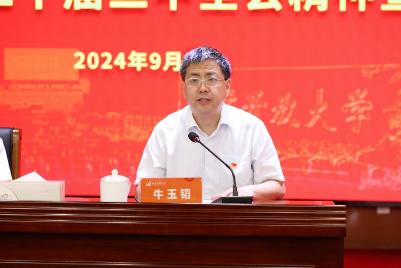 牛玉韬在主持报告会时表示,丁校长的报告视野宏阔、深入透彻,内容丰富、鲜活生动,为学校学习贯彻党的二十届三中全会精神提供了权威辅导和精准指导,进一步提升了学校党员干部对习近平总书记重要讲话的精神实质、核心要义、丰富内涵和《中共中央关于进一步全面深化改革、推进中国式现代化的决定》的深刻理解和系统把握。牛玉韬强调,学校各级党组织和全体师生员工要进一步提高政治站位,以此次宣讲为契机,持续在全面学习、全面把握、全面落实上下功夫,聚焦“教育科技人才体制机制一体改革”,紧密结合学校改革发展实际,贯彻落实好决策部署,扎实推进数智创新型大学建设。一要深学细悟,全面深入领会党的二十届三中全会重大意义。要深刻认识党的二十届三中全会的重大政治意义、重大理论意义和重大实践意义。二要统筹谋划,不折不扣抓好党的二十届三中全会精神学习宣传贯彻。要加强谋划部署、精心组织安排,深入开展学习宣传贯彻,切实做到全面系统学、全员覆盖学、全程融入学。三要笃信笃行,奋力推动党的二十届三中全会精神落地落实见行见效。要牢固树立大局观念,强化统筹协调能力,把准改革的方向、尺度和节奏,善于在大局中谋篇布局,提高干部改革攻坚能力,振奋干事创业担当精神。