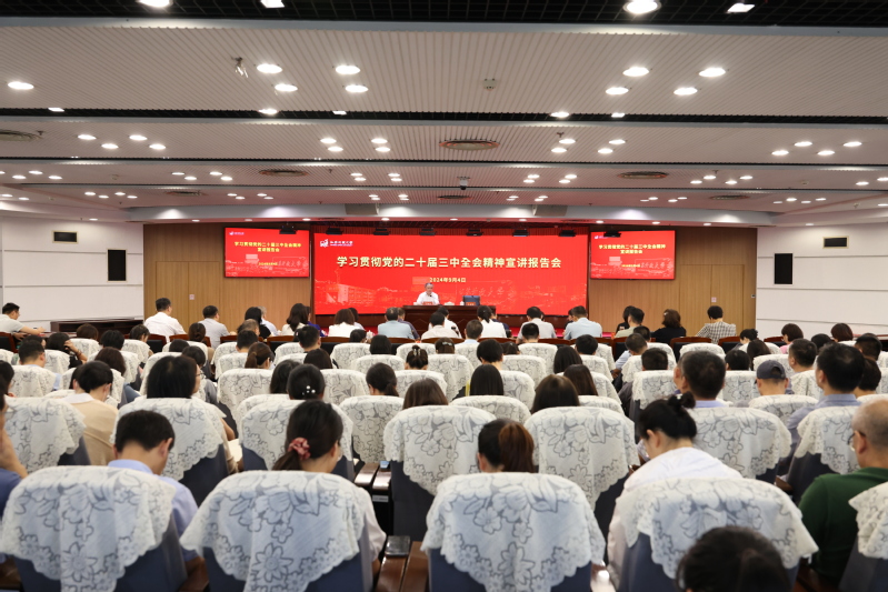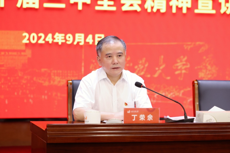 9月4日下午,我校举行学习贯彻党的二十届三中全会精神宣讲报告会。省委宣讲团成员、校党委副书记、校长丁荣余作宣讲报告。党委副书记牛玉韬主持报告会。全体校领导、中层干部、内设机构负责人、党支部书记,各民主党派、党外知识分子联谊会、欧美同学会全体成员参加会议。