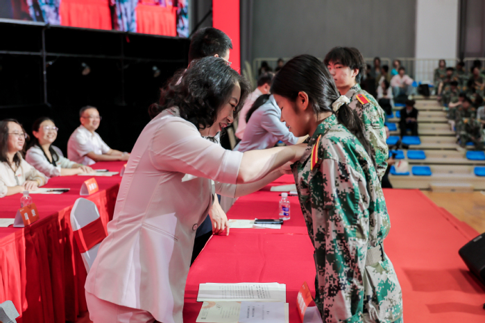 典礼上,全体校领导为2025级新生代表佩戴校徽。愿同学们以校徽为荣,努力拼搏,为校徽增添新的光彩。