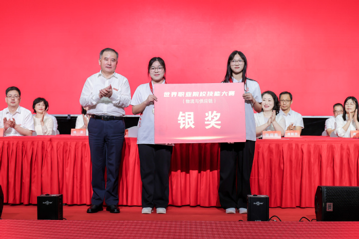在被誉为职教领域“奥林匹克”的2025年世界职业院校技能大赛总决赛上,我校商学院团队摘得国赛银奖,实现了我校该项赛事的全新突破。典礼上,党委书记丁荣余为世界职业技能大赛获奖学生代表颁发奖牌。